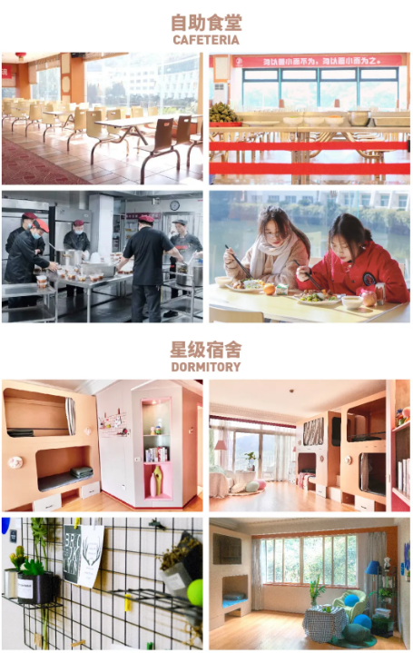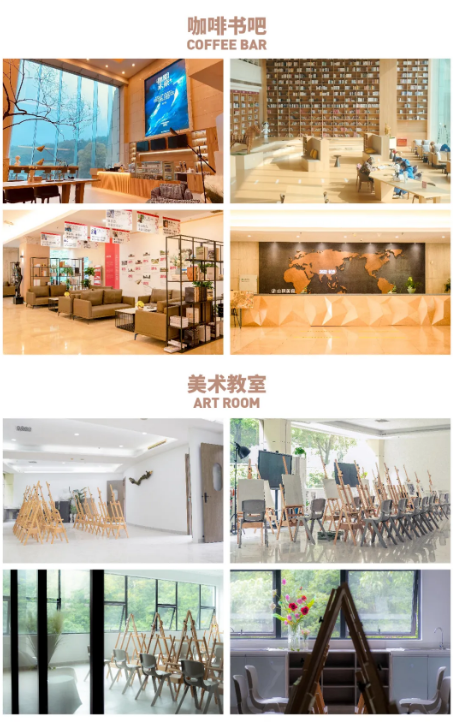 学校建立高标准自助食堂、五星级宿舍、美术馆、多媒体教室、体育馆、舞蹈室、阅览室、